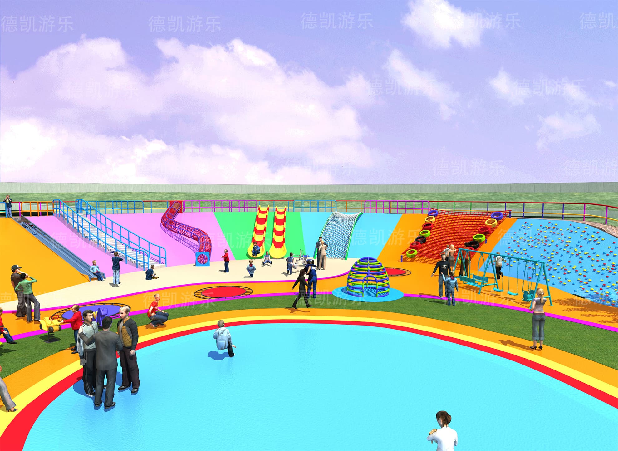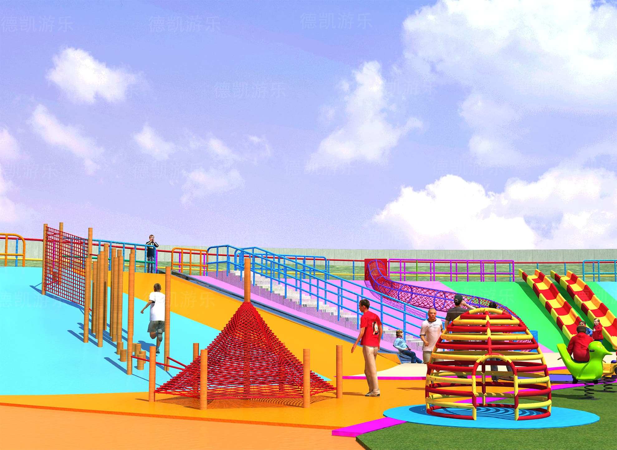 在總體效果圖中,我們大致可以看見這個(gè)游樂園的主要游樂設(shè)備:主體七彩滑梯、勇攀高峰、鉆網(wǎng)、拓展組合、地形游樂、蜘蛛游樂,且每個(gè)設(shè)備都有各自的區(qū)域范圍,構(gòu)成了這個(gè)完整的游樂園。游樂園也周圍環(huán)境相融合,融入到這座城市當(dāng)中,完善著城市的基礎(chǔ)功能。