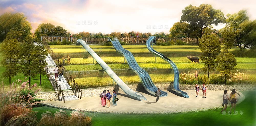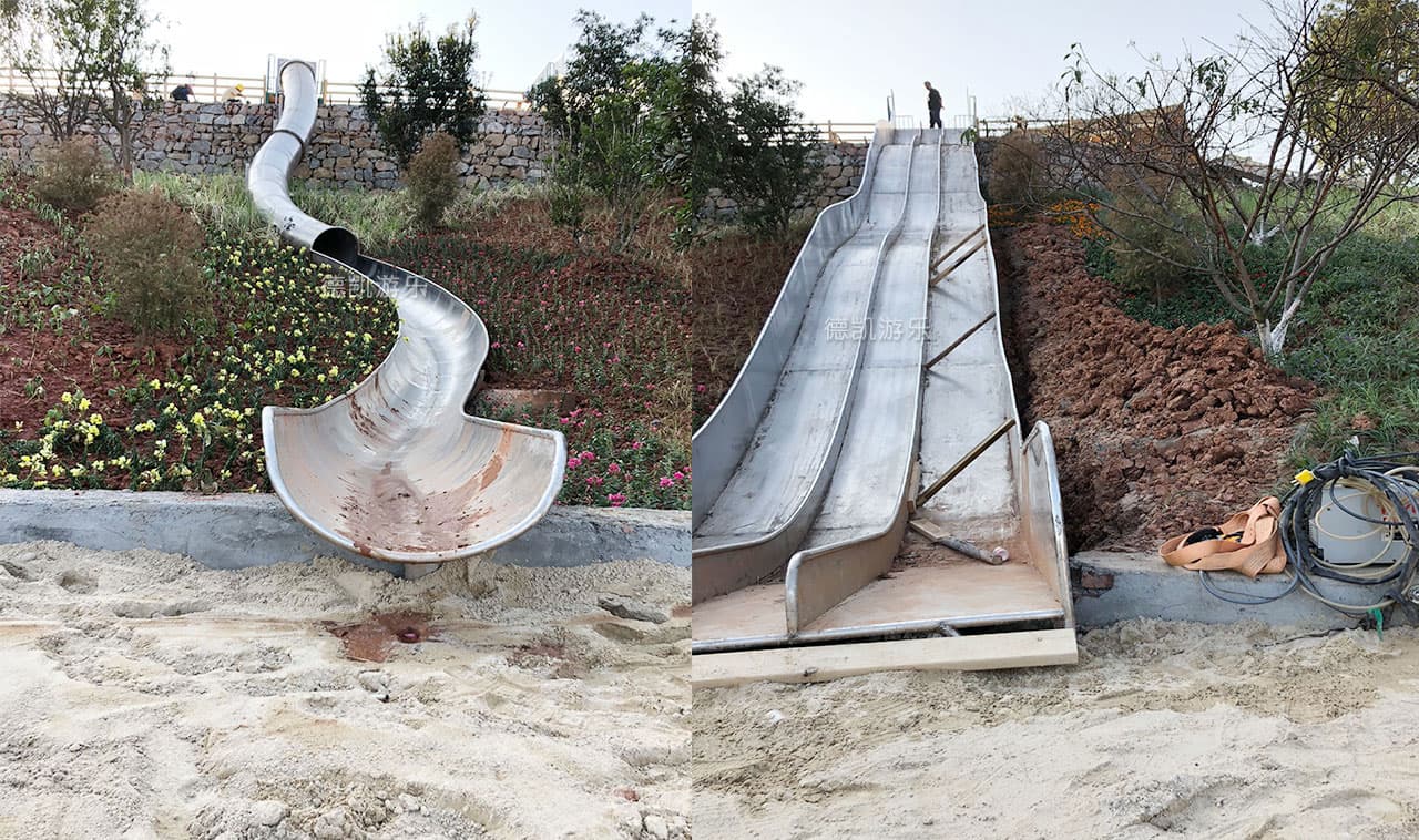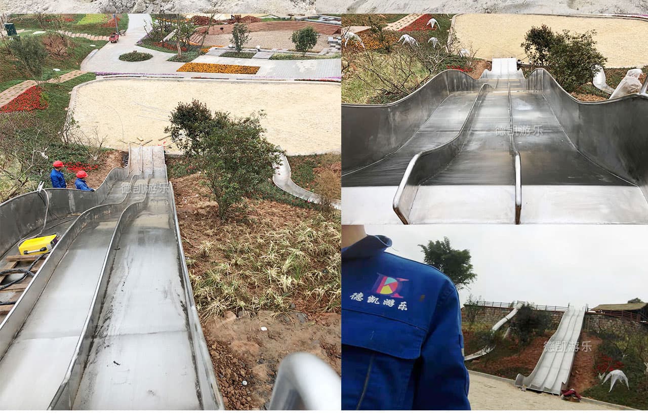 2018年9月四川德凱世界游樂(lè)設(shè)備有限公司與成都華僑城黃龍溪投資發(fā)展有限公司打造兩條20多米不銹鋼大滑道已完工。
